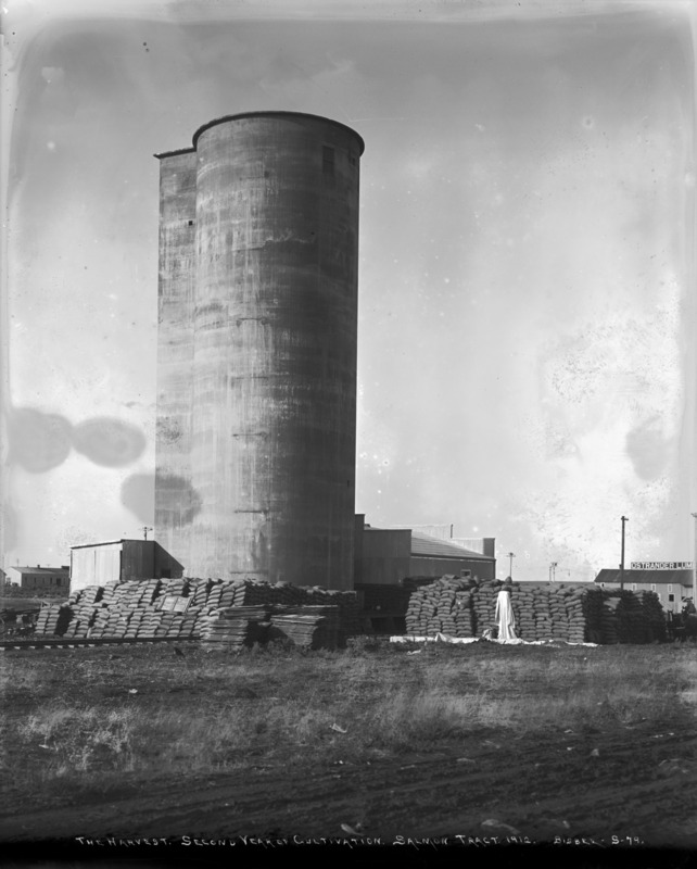- "The Harvest. Second Year of Cultivation; Salmon Tract, 1912;" silo or elevator attached to a lower building; sacks of produce piled in foreground; Ostrander Lumber building on right.