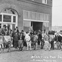 - "Starting for Jarbidge;" men and boys alongside a mule train in Twin Falls, outside the Rogerson Hotel, Avant House in background.