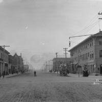 Looking southwest down Shoshone St, from the intersection with Main Ave. The roads are unpaved and many people populate the sidewalks. The Twin Falls Bank and Trust building on left and Hotel Perrine on right. Other businesses visible include Priebe Jewelry, Twin Falls Realty Company, the Perrine Hotel Cigar Store, the Rexall Drug Store.