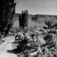 - A dirt road coming down the grade from the north side of the Snake River Canyon into the Perrine Ranch; Perrine Coulee waterfall visible on the opposite side of the canyon.