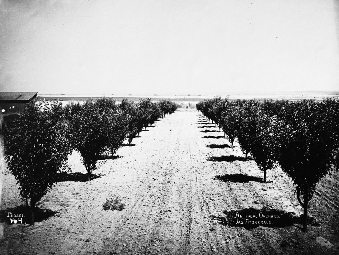 - "An Ideal Orchard. Jas {James} Fitzgerald;" rows of trees in an orchard with a building in view.