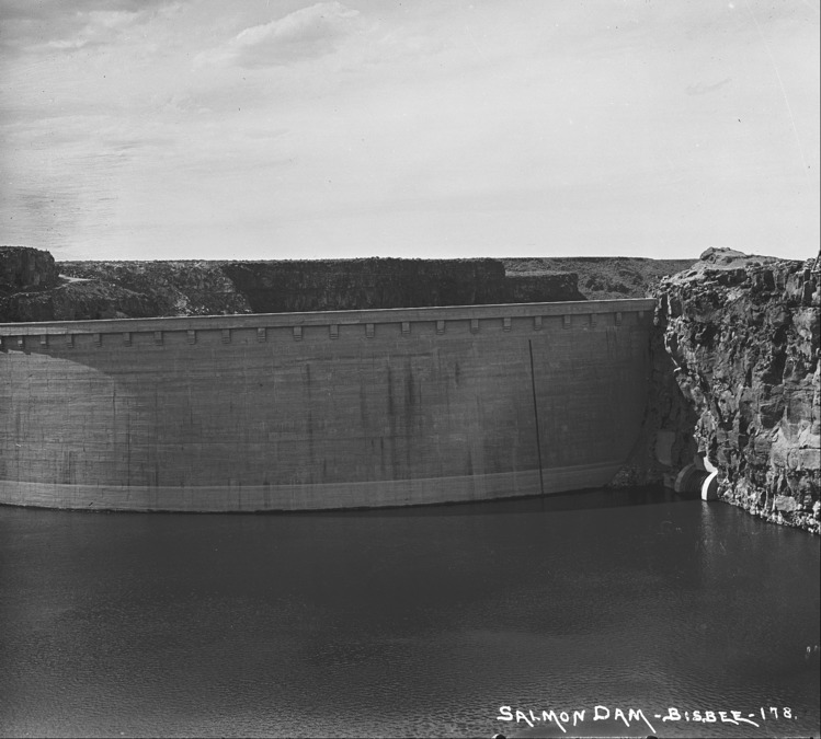 - "Salmon Dam;" water-level view of the front of the dam.