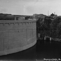- "Salmon Dam;" showing the reservoir side; buildings in background.