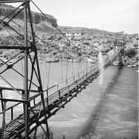 - "Auger Falls Bridge;" bridge across the Snake River in the Auger Falls area; house in background.