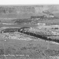 - "Blue Lakes Farm;" the Perrine land and orchard, looking north toward Blue Lakes in the Snake River Canyon. The Blue Lakes Perrine toll bridge connects the banks.