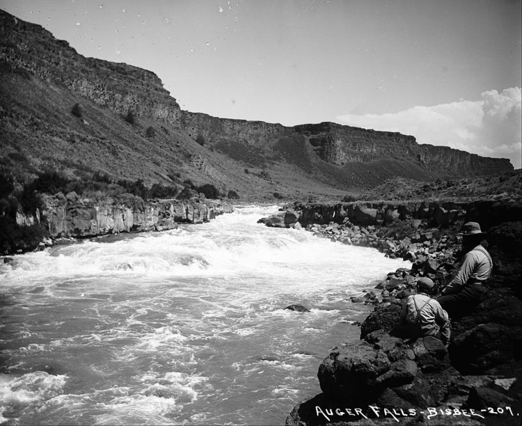 - "Auger Falls;" a man and boy, seated on rocks on the bank at the right, watch the rapids.