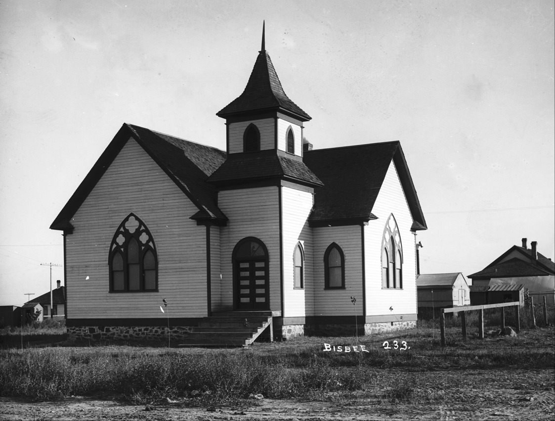 - Wood frame church; other houses and outbuildings are visible in the background.