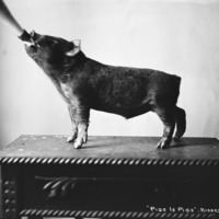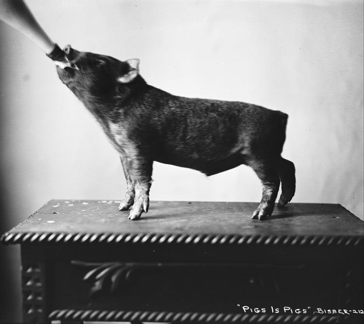 - "Pigs is Pigs;" a piglet posed on a table, drinking from a bottle.