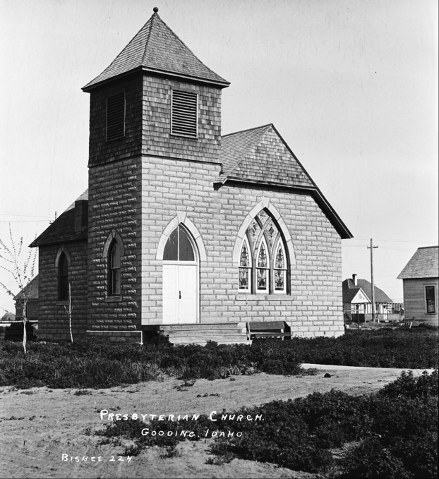 - "Presbyterian Church, Gooding, Idaho;" masonry church; other houses or outbuildings in background.