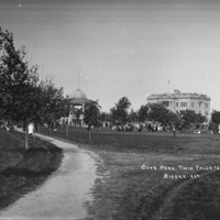 - "City Park, Twin Falls, Idaho;" many people gathered near the band stand (gazebo); County Court House in the background.