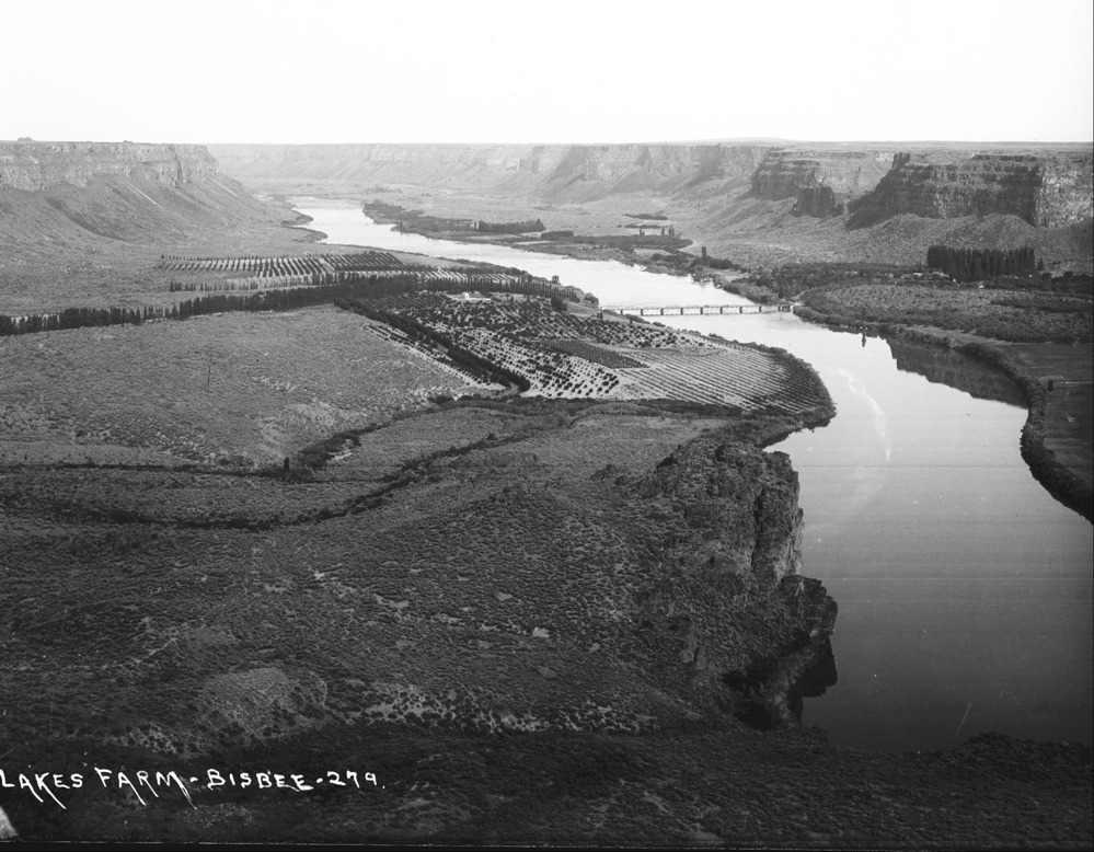 - "Blue Lakes Farm;" Perrine Ranch area of the Snake River canyon, from the rim, showing the first Perrine Bridge.