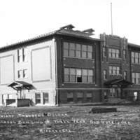 - "Thirty Thousand Dollar School Building in Three Year Old Hollister;" brick school near construction completion. A man is on the stairs at the side of the building,