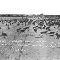 - "3067 Rabbits were killed in the morning rabbit drive of February 11, 1913;" rabbit drive, with hundreds of rabbits in the foreground being pushed down a lane by a large group of hunters in the background