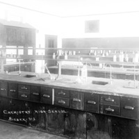 - "Chemistry. High School;" empty Twin Falls High School classroom, with lab apparatus.