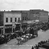 "Parade Time;" circus parade through downtown Twin Falls, Idaho. Crowds of people line the sidewalks. Visble businesses and buildings include: H. B. johnson Hardware and Implements; Buttolph Shoe Store; Idanhome Apartments; Marketing House Wholesale and Retail Groceries; Chiropodist; Cafe; Jenkins and Company; Rogerson Hotel; Farmers and Merchants Bank;