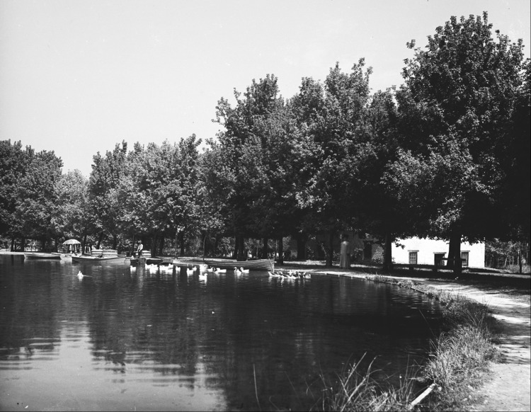 - Ducks float on a pond lined by trees and a few boats; a man stands near the boats; a building sits behind the trees.