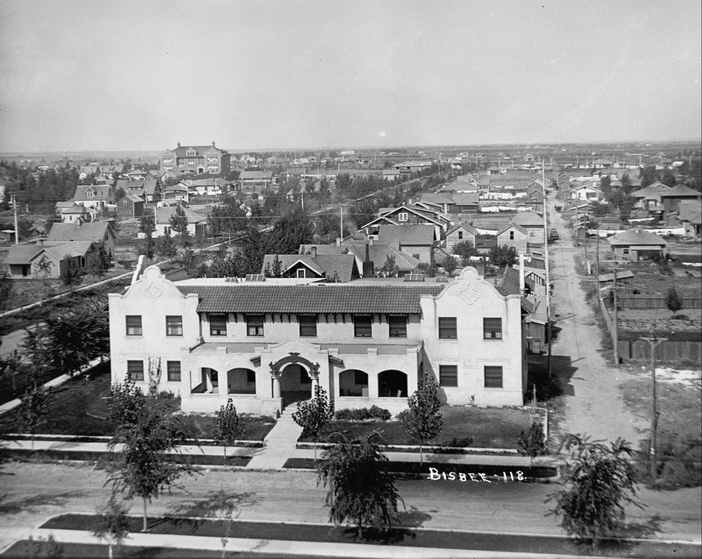 - Wide aerial view of west Twin Falls with the Justamere Inn in the foreground and Lincoln School in the background, residential house and buildings in between. Taken from atop the Twin Falls County Court House.