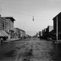 - looking northwest down Main Avenue from the Rogerson Hotel (right) and the Idaho Department Store (left). Other businesses and buildings visible include: G. F. Baker, Dentist; Bedford Drug; Twin Falls Café; Orsis Theater; Twin Falls Bank and Trust; Hotel Perrine; Lumber Co.; Eldridge's Clothing Store; Printing;