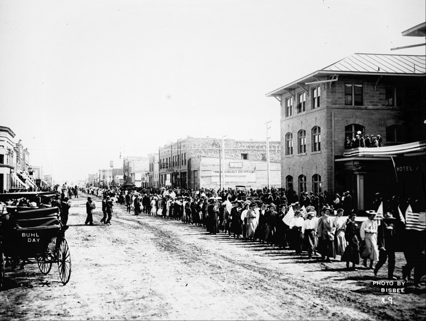 - "Buhl Day;" parade along Main Street, near Hotel Perrine. Other businesses and buildings visible include: First National Bank; McCornick Bank; Dentist; Perrine and Burton Merchandise