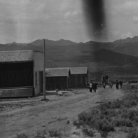 - Wood frame buildings line a dirt road of an unknown town. Several people gathered near a building in the background, or walk along the street. Mountains in background.