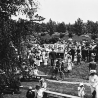 A crowd of people in City Park gathered around a with a sign that reads, " Free Ice Cream Cones;"