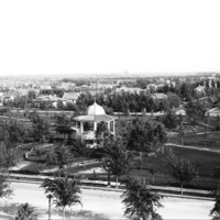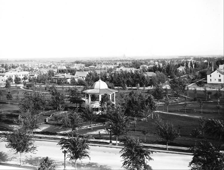 View of City Park and gazebo (band stand) from the roof of the Twin Falls County Court House, looking northeast to the neighborhood beyond the park. Also visible: Benoit Apartments; Lester Wright House (across from Benoit)