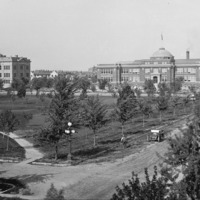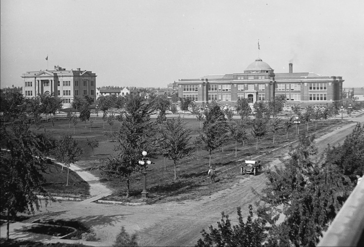 The Civic Center; aerial view of City Park and gazebo (band stand). An automobile is parked on 6th Ave E and a man works on the street beside it. . Also visible: Twin Falls County Court House; Twin Falls High School; Justamere Inn; Lincoln School in background. Photo taken from the Benoit Apartments.
