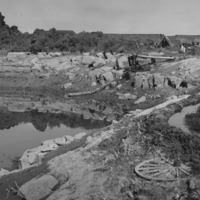 - A pumping station in the Snake River Canyon; tent, automobiles (cars), and people in the background. An old wagon wheel is half-buried in the foregreound.