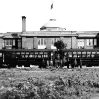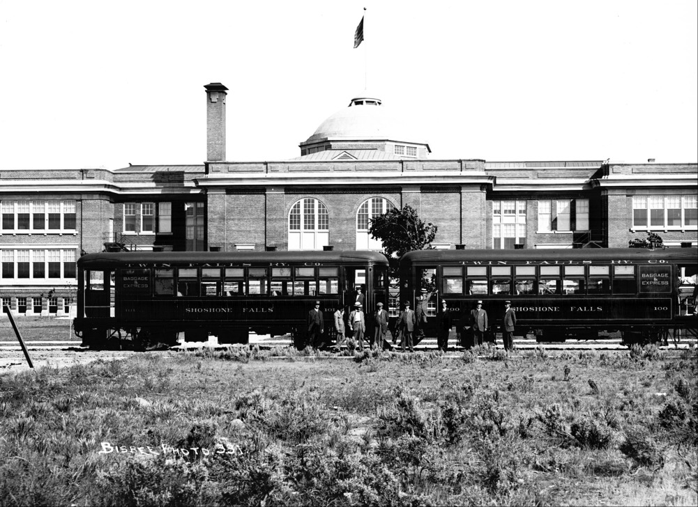 Two cars of the Twin Falls Electric Railway, parked behind the Twin Falls High School, with several men posing with the train.