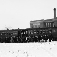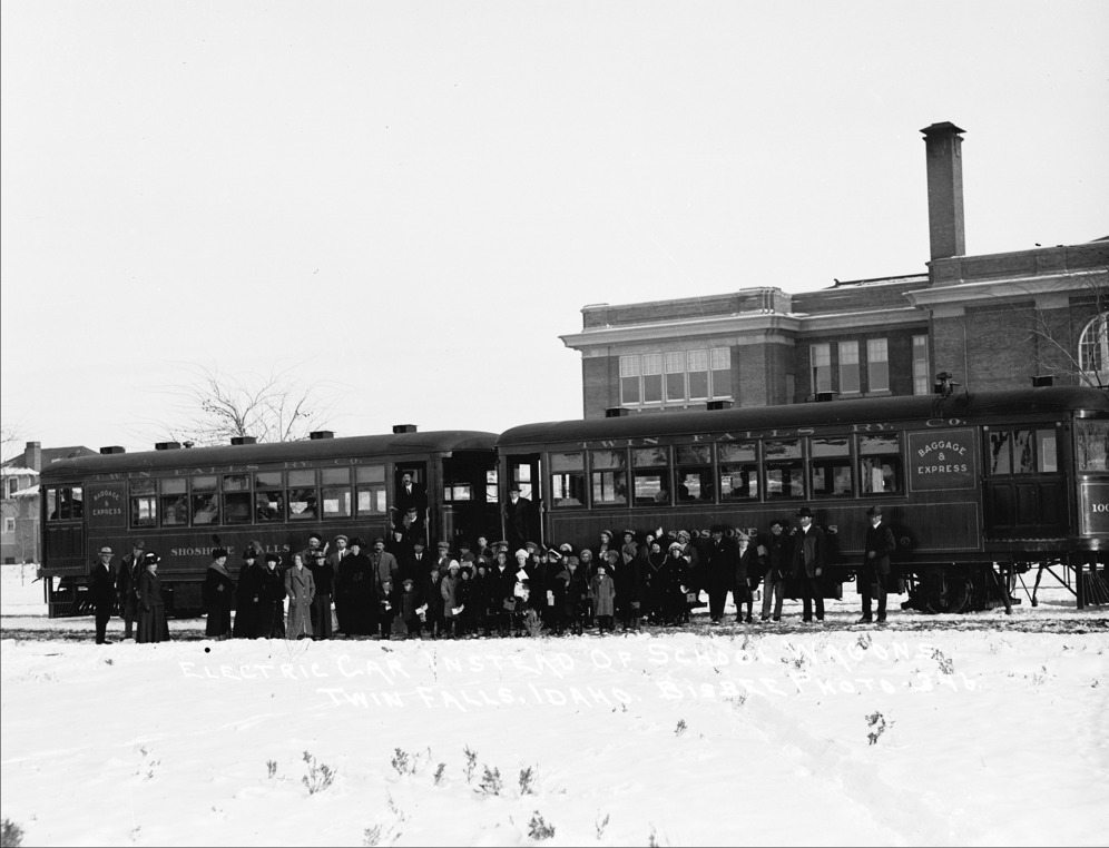 "Electric Car Instead of School Sagons, Twin Falls, Idaho;" children and adults pose in front of two railcars of the Twin Falls Electric Railway; Twin Falls High School in the background.