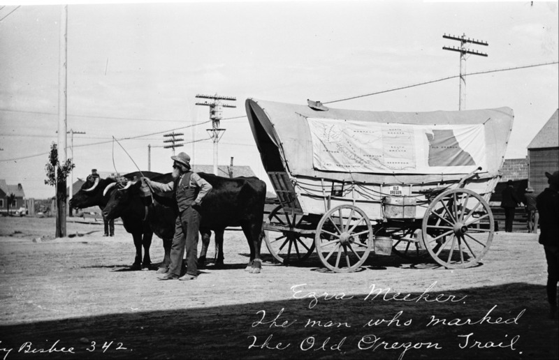 - "Ezra Meeker, The Man Who Marked the Old Oregon Trail;" Ezra Meeker stands by the two oxen pulling a covered wagon during his 1906 journey east on the Trail. The wagon has a map pinned to it depicting the route of the Oregon Trail.