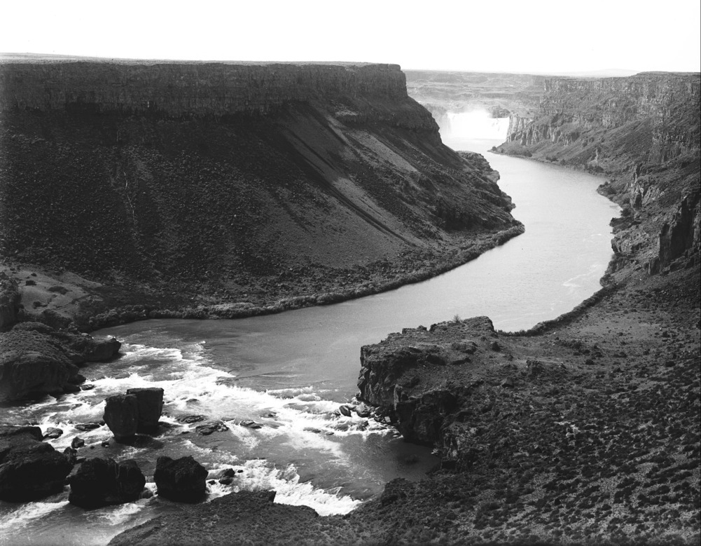 - A view of the Snake River Canyon, looking east, showing both Pillar Falls and Shoshone Falls (waterfalls). {Image is horizontally flipped.}