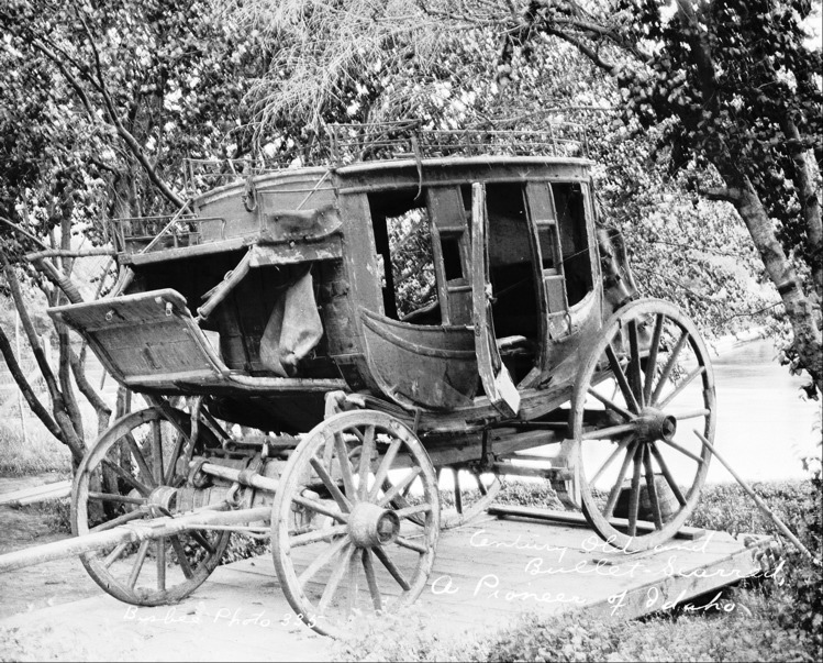 - "Century old and Bullet-Scarred, A Pioneer of Idaho;" worn stagecoach stagecoach fastened to a wooden platform among trees.