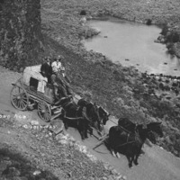 "Long Ago;" A stagecoach parked on the grade above the Blue Lakes.