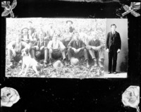 1785 Photo taken of two photographs. One shows a group of men seated outdoors, another with a single man standing in a studio.