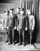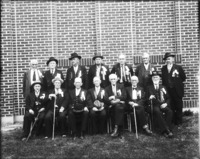 1776 A portrait of fourteen older men wearing ribbons. They are standing and seated in front of a brick building, most likely the American Legion building.
