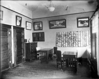 1756 Interior of the Bisbee Studio consulting room, with postcard racks on the wall and several tables and chairs.