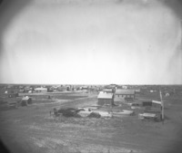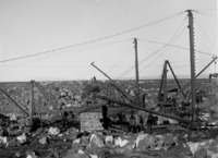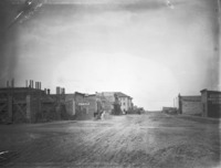 1945 A wide view of early Twin Falls townsite, looking west. The Hotel Perrine is in the middle background. Piles of lumber and a construction crew in the foreground.