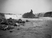 1937 Wide view of Upper Salmon Falls from creek level; rock formation in middle