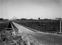 1893 The bridge over Rock Creek, at the west end of Shoshone St, from the west; with the Oregon Short Line Railroad Depot (Station) and other buildings in the distance. (Singing Bridge).
