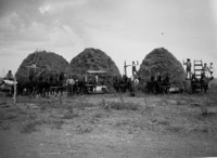 1894 Five harvesting crews and teams of horses, posing before three large stacks of grain. Children on some of the horses.