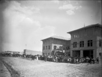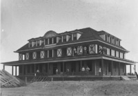1890 Workmen assembled on the roof sections and on the ground before the nearly completed hotel at Milner Dam.