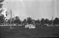 C 004 People gather around the edges of the park near the maypoles on May Day in Twin Falls City Park. Several houses can be seen in the background.