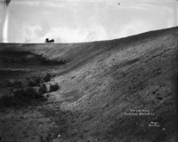 B 108 "Ditch Camp. North Side;" wide view of construction camp, with several tents and outbuildings among the sage brush. Several teams of horses at work on the left.