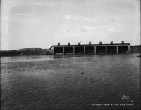 B 102 "Head Gates at Wilson's Lake;" view along berm beside gates of North Side; a man stand at the gates; a building in background at right