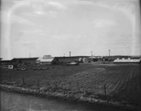 B 084 Wide view of Winona Stock Farm, near Jerome, Idaho; pigs in a field at the farmstead, with a barn, house, and several outbuildings; a windmill is visible in the background.