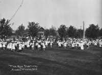 PC-2331 "The May Poles;" two groups of young women dressed in white at maypoles, with a crowd of people watching in City Park on May Day.