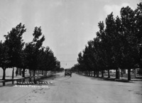 PC-2329 "Shoshone Street;' an automobile (car) drives down the center of the street lined with trees.The Methodist Church can be seen beneth the treeline on the right.