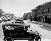PC-2340 Automobiles (cars) parked in the center of the street (Main Ave); Perrine Hotel on right; Also visible: Brunswick Billiard Parlor; Drugs; First National Bank, Cafe, Shodair Rooms, Shoes, Rogerson Hotel, Golden Rule; Booth's, Candy, Twin Falls Cafe, Ladies and Gents Shine, Alco Clothing Shop. Pedestrians and bicycles on sidewalks.