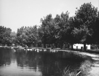 PC-2342 Ducks float on a pond lined by trees and a few boats; a man stands near the boats; a building sits behind the trees.